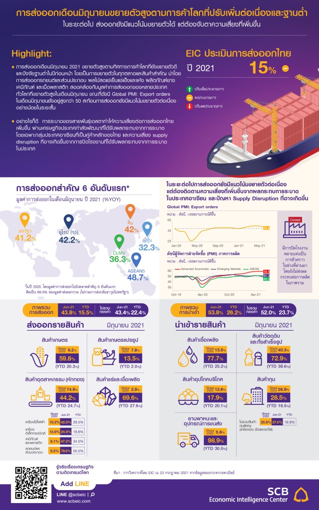 EIC ธนาคารไทยพาณิชย์ เผยการส่งออกเดือนมิถุนายน 2021 ขยายตัวสูงตามทิศทางการค้าโลกที่ยังขยายตัวดี และปัจจัยฐานต่ำ ในปีก่อนหน้า โดยเป็นการขยายตัวในทุกตลาดและสินค้าสำคัญ นำโดยการส่งออกรถยนต์และส่วนประกอบ ผลไม้สด แช่เย็น แช่แข็งและแห้ง ผลิตภัณฑ์ยาง เคมีภัณฑ์ และเม็ดพลาสติก สอดคล้องกับมูลค่าการส่งออกของหลายประเทศทั่วโลกที่ขยายตัวสูงในเดือนมิถุนายน ขณะที่ดัชนี Global PMI: Export orders ในเดือนมิถุนายนยังอยู่สูงกว่า 50 สะท้อนการส่งออกยังมีแนวโน้มขยายตัวต่อเนื่องอย่างน้อยในระยะสั้น