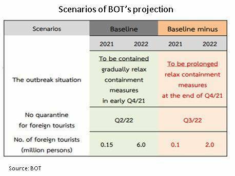 ล่าสุด ธปท.ได้ปรับลดคาดการณ์ GDP ปีนี้และปีหน้าเป็นขยายตัว 0.7% และ 3.7% จากเดิมคาด 1.8% และ 3.9% ตามลำดับ ผลกระทบจากการระบาดของ COVID-19 ที่มากกว่าคาด ส่งผลให้อุปสงค์ในประเทศและจำนวนนักท่องเที่ยวต่างชาติลดลงจากประมาณการเดิม โดยกรณีฐาน หากควบคุมการระบาดได้และผ่อนคลายมาตรการต้นไตรมาส 4/2564 จะมีนักท่องเที่ยว 1.5 แสนคนในปีนี้ และ 6 ล้านคนในปีหน้า แต่หากการระบาดยืดเยื้อและผ่อนคลายได้ในปลายไตรมาส 4/2564 จะเหลือนักท่องเที่ยวปีนี้เพียง 1 แสนคน และปีหน้า 2 ล้านคน