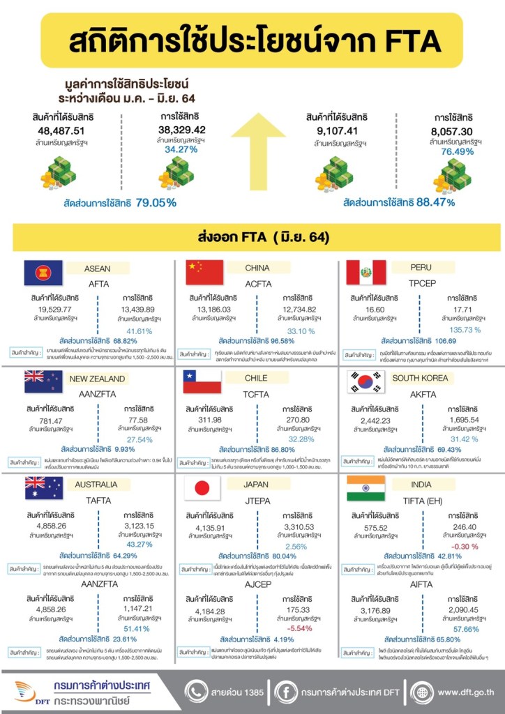 สำหรับครึ่งแรกปี 2564 ไทยมีการใช้สิทธิประโยชน์ทางการค้าเพื่อส่งออกภายใต้กรอบ FTA ต่างๆ เพิ่มขึ้น สอดคล้องกับทิศทางการส่งออก อาทิ อาเซียน เพิ่มขึ้น 41.61% เปรู เพิ่มขึ้น 126.19% ออสเตรเลีย เพิ่มขึ้น 45.37% ชิลี เพิ่มขึ้น 32.28% จีน เพิ่มขึ้น 33.10% อินเดีย เพิ่มขึ้น 48.55% เป็นต้น