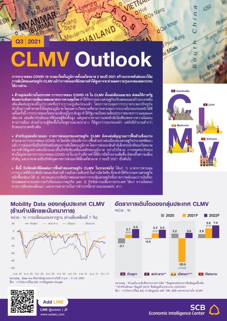 EIC SCB เผยการระบาดของ COVID-19 ที่รุนแรงขึ้นในภูมิภาค และการฉีดวัคซีนที่ยังอยู่ในระดับต่ำ เป็นปัจจัยกดดันสำคัญที่ทำให้เศรษฐกิจ CLMV ชะลอลงกว่าคาดในปี 2564 อย่างไรก็ตาม การส่งออกที่ปรับตัวเพิ่มขึ้นตามทิศทางการค้าโลก จะช่วยลดผลกระทบต่อเศรษฐกิจได้บ้าง โดยเฉพาะเวียดนามที่ได้ประโยชน์จากการมีสัดส่วนส่งออกสินค้าหมวดอิเล็กทรอนิกส์ในระดับสูง