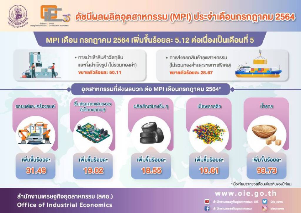 นายทองชัย ชวลิตพิเชฐ ผู้อำนวยการสำนักงานเศรษฐกิจอุตสาหกรรม (สศอ.) กล่าวว่า ดัชนี MPI เดือนกรกฎาคม 64 อยู่ที่ระดับ 91.41 ขยายตัวเพิ่มขึ้น 5.12% เมื่อเทียบกับเดือนเดียวกันของปีก่อน โดยอุตสาหกรรมสำคัญที่ส่งผลให้ MPI ขยายตัว อาทิเช่น รถยนต์และเครื่องยนต์ ชิ้นส่วนและแผ่นวงจรอิเล็กทรอนิกส์ และผลิตภัณฑ์ยางอื่น ๆ เป็นต้น เนื่องจากมีความต้องการตามคำสั่งซื้อที่เพิ่มขึ้นต่อเนื่อง จากตัวเลขการส่งออกสินค้าอุตสาหกรรม (ไม่รวมทองคำ อาวุธ รถถัง และอากาศยาน) มูลค่า 541,763.15 ล้านบาท ขยายตัวสูงถึง 28.67%
