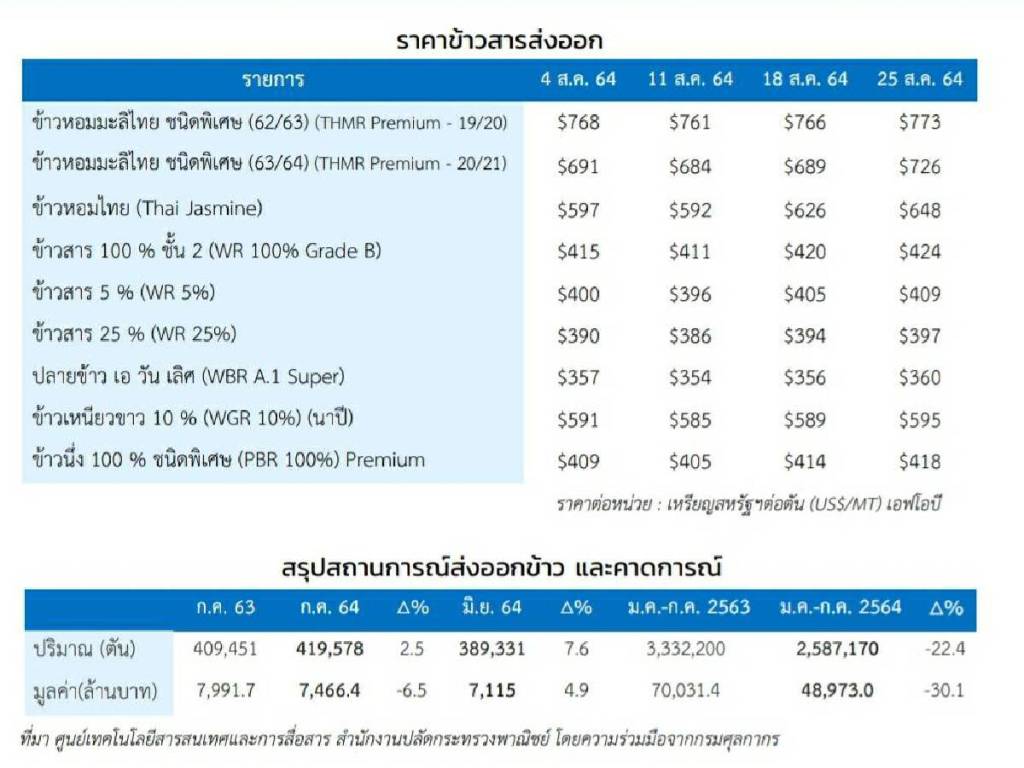 การส่งออกข้าวในเดือนกรกฎาคม 2564 มีปริมาณ 419,578 ตัน มูลค่า 7,466 ล้านบาท โดยปริมาณและมูลค่าส่งออกเพิ่มขึ้น 7.6% และ 4.9% เมื่อเทียบกับเดือนมิถุนายน 2564 ที่มีการส่งออกปริมาณ 389,331 ตัน มูลค่า 7,115 ล้านบาท เนื่องจากในช่วงนี้ราคาข้าวของไทยปรับลดลงตามภาวะตลาดและค่าเงินบาทที่อ่อนค่าลง ทำให้สามารถแข่งขันกับประเทศคู่แข่งที่สำคัญโดยเฉพาะอินเดียได้ ส่งผลให้การส่งออกข้าวนึ่งมีปริมาณเพิ่มขึ้นมากจากเดือนก่อน โดยในเดือนกรกฎาคม มีการส่งออกข้าวนึ่งปริมาณ 175,522 ตัน เพิ่มขึ้น 107.4% เมื่อเทียบกับเดือนก่อน ส่วนใหญ่ส่งไปยังตลาดหลัก เช่น แอฟริกาใต้ เยเมน เบนิน ไนเจอร์ แคเมอรูน เป็นต้น