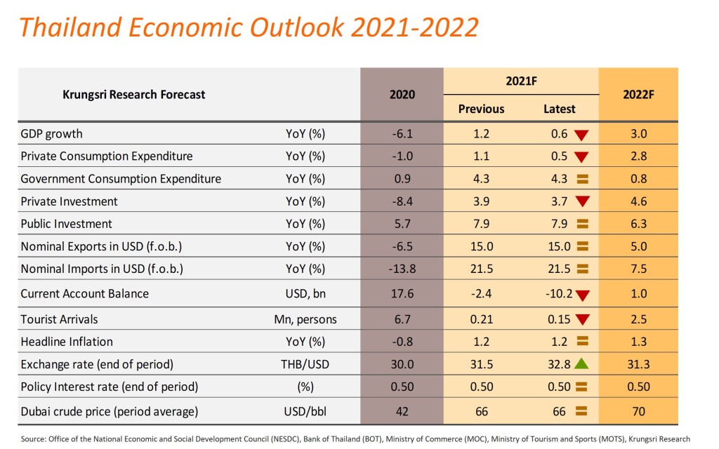 ในมุมมองของวิจัยกรุงศรี ผลกระทบที่มากขึ้นในวงกว้างของการระบาดครั้งล่าสุดและผลกระทบด้านอุปทานจะฉุดการเติบโตของเศรษฐกิจไทยลง 0.9 จุด ในแง่บวก คาดว่ารัฐบาลจะออกมาตรการกระตุ้นเศรษฐกิจเพิ่มเติมมูลค่า 5 หมื่นล้านบาทในปีนี้ ซึ่งอาจเพิ่มการเติบโตของ GDPได้ 0.3 จุด