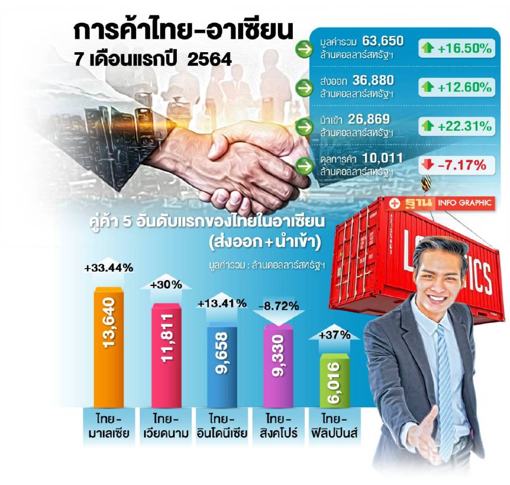 อาเซียนถือมีความสำคัญกับการค้าการลงทุนของไทยมายาวนาน โดยในปี 2563 ไทยมีมูลค่ากับอาเซียน(9 ประเทศ) 94,623 ล้านดอลลาร์สหรัฐฯ (2.94 ล้านล้านบาท) และ 7 เดือนแรกของปีนี้มีมูลค่าการค้า 63,750 ล้านดอลลาร์สหรัฐฯ (1.95 ล้านล้านบาท) ขยายตัวเพิ่มขึ้น 16.50% เมื่อเทียบกับช่วงเดียวกันของปีก่อน ถือเป็นสัญญาณที่ดีว่าการค้าระหว่างไทยกับอาเซียนในภาพรวมยังสดใส แม้ไทยและประเทศสมาชิกยังเผชิญกับวิกฤติการแพร่ระบาดของโรคโควิด-19