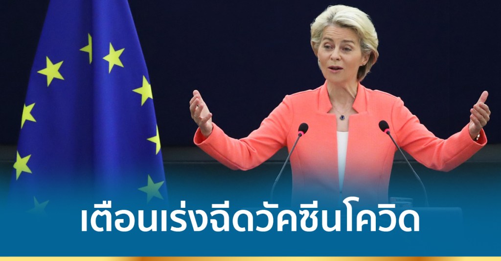 สตราสบูร์ก 15 ก.ย. – นางเออร์ซูลา ฟอน เดอร์ เลเยน ประธานคณะกรรมาธิการสหภาพยุโรป หรืออียู กล่าวคำปราศรัยเกี่ยวกับนโยบายประจำปีในวันนี้ว่า ทั่วโลกต้องเร่งฉีดวัคซีนป้องกันโรคติดเชื้อไวรัสโคโรนา 2019 หรือโควิด-19 ให้เร็วขึ้นเพื่อป้องกันการระบาดในกลุ่มผู้ที่ยังไม่ได้รับการฉีดวัคซีน