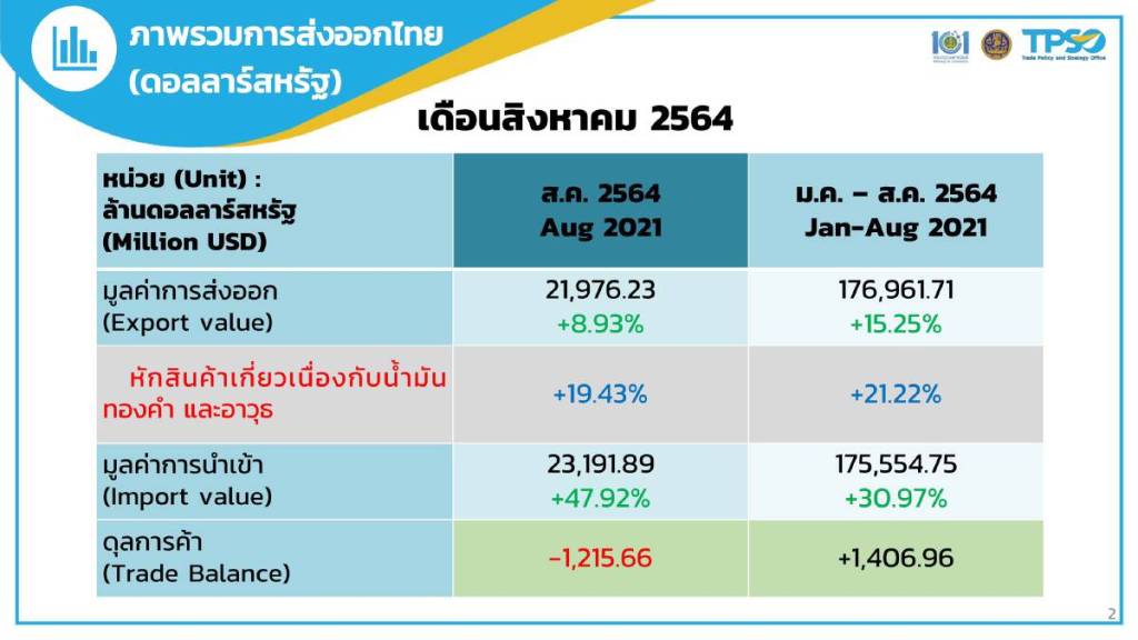นายจุรินทร์ ลักษณวิศิษฏ์ รองนายกรัฐมนตรีและรัฐมนตรีว่าการกระทรวงพาณิชย์ เปิดเผยว่า การส่งออกเดือนส.ค.2564 มีมูลค่า 21,976.23 ล้านดอลลาร์สหรัฐ เพิ่มขึ้น 8.93% โดยถือว่าชะลอตัวลงจากเดือนก.ค.2564 เพราะได้รับผลกระทบจากโควิด-19 ที่มีการล็อกดาวน์ และบางโรงงานผลิตบางแห่งปิด รวมถึงระบบโลจิสติกส์มีปัญหาติดขัด ขณะที่กานำเข้าขยายตัว23,191ล้านดอลลาร์สหรัฐ ขยายตัว47.92% แต่ดุลการค้ากกลับติดลบ1,215ล้านดอลลาร์สหรัฐ