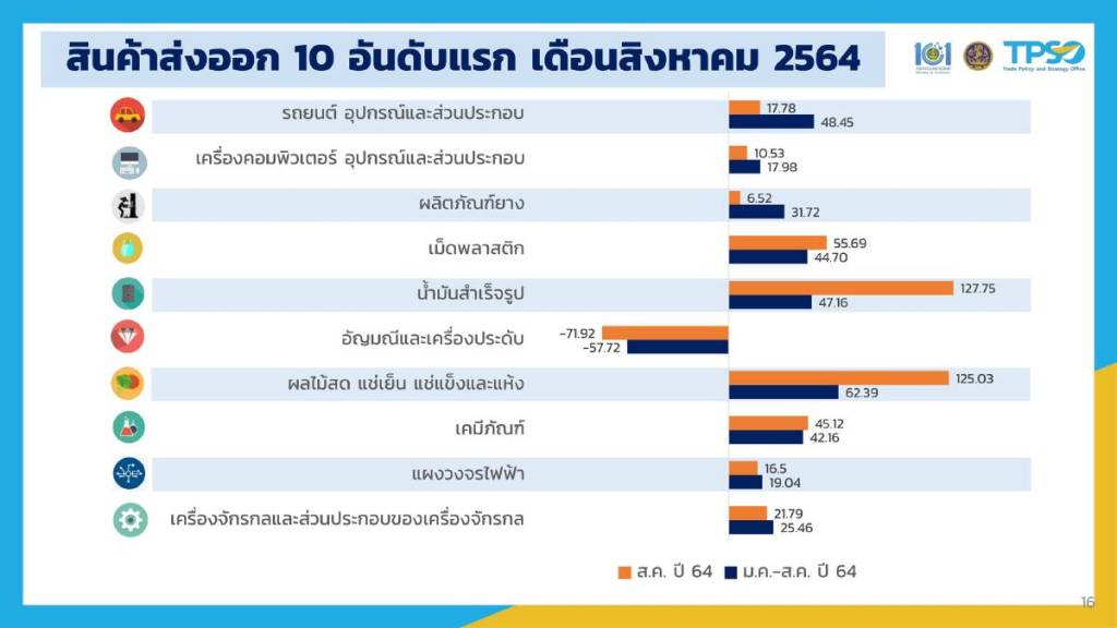 สำหรับปัจจัยที่สนับสนุนการส่งออกในเดือนส.ค.2564 ที่ทำให้เป็นบวกได้ มาจากการแก้ไขปัญหาเชิงรุกและต่อเนื่องของ กรอ.พาณิชย์ การฟื้นตัวของเศรษฐกิจโลก ที่อังค์ถัดประเมินว่าจะโตเร็วสุดในรอบ 50 ปี โตมากในสหรัฐฯ จีน ญี่ปุ่น สหภาพยุโรป เป็นต้น ดัชนีผู้จัดการฝ่ายจัดซื้อของโลก หรือ PMI เกินระดับ 50 ต่อเนื่อง 14 เดือน แปลว่าพร้อมซื้อ และอย่างน้อยซื้อจากไทยด้วย และค่าเงินบาทอ่อนค่าในช่วงหลายเดือน ส่งผลให้ขีดความสามารถในการแข่งขันด้านราคาของไทยสูงขึ้น ขายสินค้าได้มากขึ้น