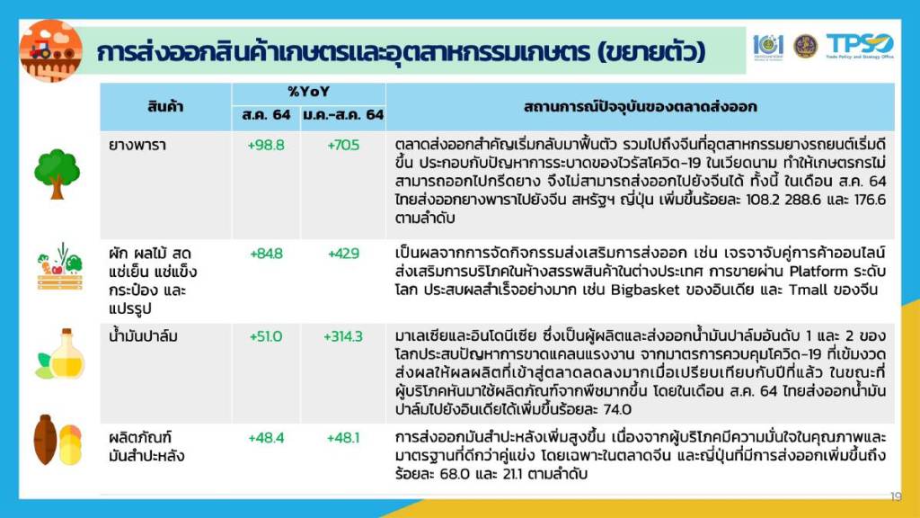 สำหรับการส่งออกที่ขยายตัว มาจากการเพิ่มขึ้นของการส่งออกสินค้าเกษตรและอุตสาหกรรมการเกษตร 23.6% และหากดูลึกในรายสินค้า พบว่า ผลิตภัณฑ์ยางพารา เพิ่ม 98.8% บวกต่อเนื่อง 11 เดือน ผลไม้สด แช่เย็น แช่แข็งและแปรรูป เพิ่ม 84.8% บวก 5 เดือนต่อเนื่อง น้ำมันปาล์ม เพิ่ม 51.0% บวก 6 เดือนต่อเนื่อง ผลิตภัณฑ์มันสำปะหลัง เพิ่ม 48.4% บวก 10 เดือนต่อเนื่อง ข้าวเพิ่ม 25.4% กลับมาบวกครั้งแรกในรอบ 8 เดือน และอาหารสัตว์เพิ่ม 17.3 บวก 24 เดือนต่อเนื่อง
