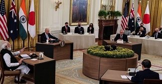 การประชุมที่จัดขึ้นที่ทำเนียบขาวของสหรัฐของกลุ่มภาคี 4 ฝ่าย ควอด ที่ประกอบไปด้วย ประธานิบดีโจ ไบเดน ของสหรัฐ นายกรัฐมนตรีโยชิฮิเดะ ซูงะ ของญี่ปุ่น นายกรัฐมนตรีนเรนทรา โมดี ของอินเดีย และนายกรัฐมนตรีสก็อตต์ มอร์ริสัน ของออสเตรเลีย การรวมกลุ่มพันธมิตรในครั้งนี้กำลังถูกจีนเฝ้าจับตามองอย่างใกล้ชิดแม้จะวิพากษ์วิจารณ์ว่า การรวมครั้งนี้มีทีท่าว่าจะไม่ประสบความสำเร็จ หลังการประชุมเป็นเวลา 2ชั่วโมง ผู้นำทั้ง 4 ออกแถลงการณ์ร่วมกันว่า กลุ่มควอดยึดมั่นในหลักนิติธรรม เสรีภาพของการเดินเรือและการบิน การหาทางยุติข้อพิพาทอย่างสันติ ค่านิยมประชาธิปไตยและบูรณภาพแห่งดินแดน แม้ว่าจะไม่มีการเอ่ยชื่อประเทศจีนในถ้อยแถลงของผู้นำทั้ง 4 และในแถลงการณ์ร่วม แต่รัฐบาลปักกิ่งก็เป็นเป้าหมายสำคัญของการรวมกลุ่มในครั้งนี้ แถลงการณ์กล่าวด้วยว่า กลุ่มควอด สนับสนุนเสรีภาพ การเปิดกว้าง ความเป็นระเบียบ พื้นฐานของกฏหมายระหว่างประเทศ โดยไม่ย่อท้อกับการกดดัน เพื่อสนับสสุนความมั่นคงและความรุ่งเรืองในภูมิภาคอินโด-แปซิฟิกและดินแดนอื่น ๆ นอกจากยนั้น ยังเรียกร้องให้เกาหลีเหนือหันหน้ามาเข้าร่วมแนวทางด้านการทูตเรื่องการพัฒนานิวเคลียร์ของเกาหลีเหนือ โครงการขีปนาวุธ ซึ่งเป็นสิ่งที่เกาหลีเหนือปฎิเสธที่จะดดำเนินการหากยังนานาประเทศยังไม่ยกเลิกมาตรการลงโทษเกาหลีเหนือ.