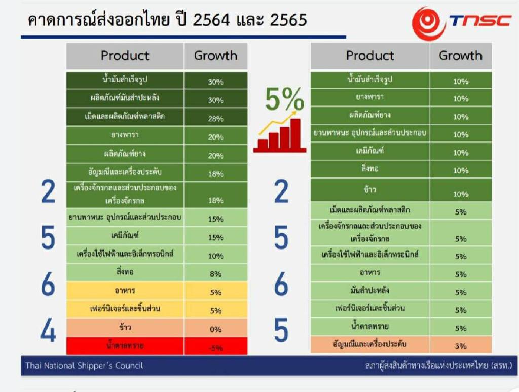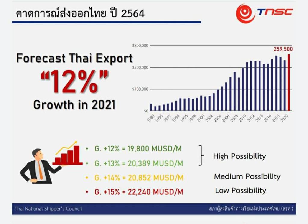 นายชัยชาญ เจริญสุข ประธานสภาผู้ส่งสินค้าทางเรือแห่งประเทศไทย (สรท.)เปิดเผยว่า สรท. ยังคงคาดการณ์การส่งออกไทยในปี้ เติบโต 12% และคาดการณ์ปี 2565 เติบโต 5% (ณ เดือนพฤศจิกายน 2564) ทั้งนี้ปัจจัยที่ยังน่าเป็นห่วงในช่วง3เดือนที่เหลือคือปัญหาค่าระวางเรือยังคงทรงตัวในระดับสูงต่อเนื่อง โดยเฉพาะสหภาพยุโรป และสหรัฐฯ รวมถึงค่าใช้จ่ายส่วนเพิ่ม ไม่ว่าจะเป็น Peak Season Surcharge (PSS) ส่งผลต่อภาระต้นทุนการขนส่งสินค้าที่ผู้ส่งออกต้องจ่ายเพิ่มขึ้นหลายเท่าตัว และปัญหา Space and Container allocation