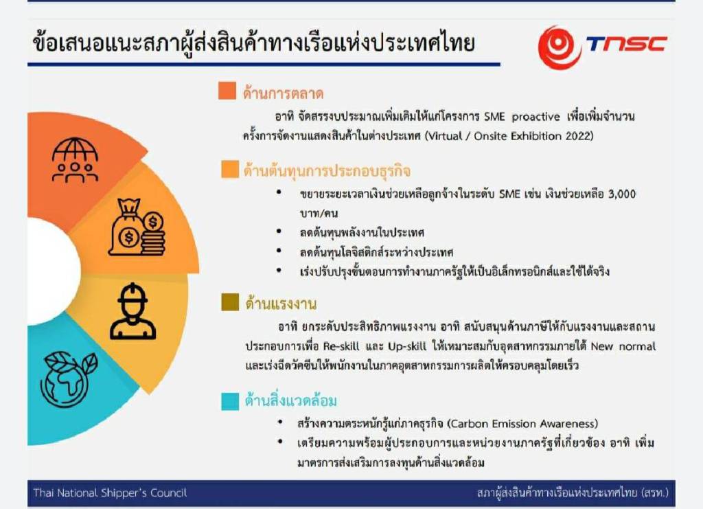 ทั้งนี้ สรท. มีข้อเสนอแนะไปยังหน่วยงานรัฐ ไม่ว่าจะเป็น ด้านการตลาด อย่างจัดสรรงบประมาณเพิ่มเติมให้แก่โครงการ SMEs Pro-active เพื่อเพิ่มจำนวนครั้งการจัดงานแสดงสินค้าในต่างประเทศ (Virtual / Onsite exhibition 2022) ให้มากขึ้น ด้านต้นทุนการประกอบธุรกิจ เช่นขยายระยะเวลาเงินช่วยเหลือลูกจ้างให้กับสถานประกอบการระดับ SMEs การสนับสนุนเงินช่วยเหลือ 3,000 บาทต่อคน เพื่อคงสถานะการจ้างงาน การลดต้นทุนพลังงานในประเทศ และการลดต้นทุนโลจิสติกส์ระหว่างประเทศ และเร่งปรับปรุงขั้นตอนการทำงานภาครัฐให้เป็นอิเล็กทรอนิกส์และใช้ได้จริง
