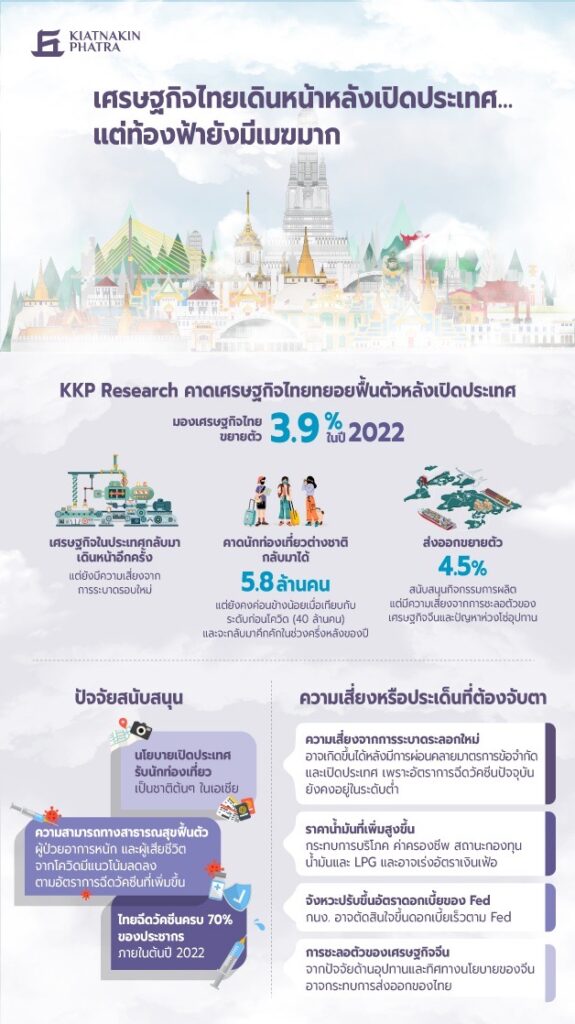 KKP Research ประเมินเศรษฐกิจไทยปี 65 ฟื้นตัวระดับต่ำอยู่ที่ 3.9% คาดนักท่องเที่ยวทยอยกลับมาอย่างช้าๆ ปี 65 อยู่ที่ 5.8 ล้านคน จากก่อนโควิดปีละ 40 ล้านคน มอง 3 ปัจจัยหลักฉุดท่องเที่ยวฟื้นตัวจำกัด ชี้จับตาความเสี่ยงเงินเฟ้อ-เศรษฐกิจจีนชะลอตัว-ดอกเบี้ยไทยถูกดัน