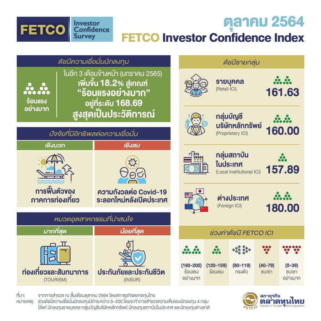 นายไพบูลย์ นลินทรางกูร ประธานกรรมการ สภาธุรกิจตลาดทุนไทย(FETCO) เปิดเผยในงานแถลงข่าว FETCO ประจำเดือนพ.ย.64 ว่าดัชนีความเชื่อมั่นนักลงทุน (FETCO Investor Confidence Index: ICI) ในอีก 3 เดือนข้างหน้า อยู่ที่ระดับ 168.69 สูงสุดเป็นประวัติการณ์ตั้งแต่เริ่มทำการจัดทำดัชนี โดยปรับตัวเพิ่มขึ้น 18.2% จากเดือนก่อนหน้ามาอยู่ในเกณฑ์ “ร้อนแรงอย่างมาก”