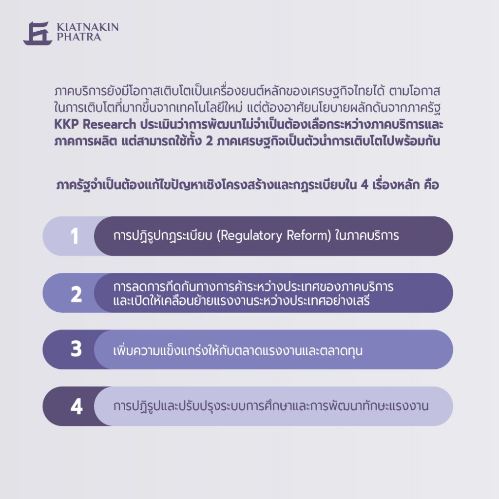 KKP Research โดยเกียรตินาคินภัทร สรุปภาพรวมว่าเพื่อให้ประเทศไทยได้ประโยชน์และสามารถพัฒนาภาคบริการได้อย่างเต็มที่ในระยะต่อไป จำเป็นต้องดำเนินนโยบายในอย่างน้อย 4 เรื่องหลัก