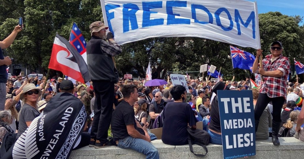 ชาวนิวซีแลนด์ราว 3,000 คน ซึ่งส่วนใหญ่ไม่สวมหน้ากากอนามัย ได้เดินขบวนมารวมตัวกันที่บริเวณหน้ารัฐสภานิวซีแลนด์ในกรุงเวลลิงตัน ผู้ชุมนุมบางคนถือธงที่มีข้อความว่า ‘ทรัมป์ 2020’ ขณะที่คนอื่น ๆ ชูป้ายข้อความที่ฝากมาจากลุ่มชาวเมารี ซึ่งเป็นชนพื้นเมืองของนิวซีแลนด์ ผู้ที่ได้รับผลกระทบจากมาตรการล็อกดาวน์ และคุณครูที่อาจตกงานหากปฏิเสธการฉีดวัคซีนโควิด นอกจากนี้ ยังมีกลุ่มผู้ชุมนุมที่มุ่งเป้าโจมตีนายกรัฐมนตรีจาซินดา อาร์เดิร์น ของนิวซีแลนด์ ด้วยการถือป้ายที่มีข้อความ เช่น ‘สนับสนุนทางเลือก ต่อต้านจาซินดา’ (Pro Choice, Anti Jacinda) และ ‘สื่อมวลชนโกหก’ (Media Lies) อย่างไรก็ดี การชุมนุมดังกล่าวเป็นไปอย่างสงบ และได้สลายการชุมนุมในเวลาต่อมาหลังเสร็จสิ้นการเต้นแบบพื้นเมืองของชาวเมารีที่เรียกว่า ฮากา (haka) ซึ่งเป็นการแสดงออกได้หลายแบบทั้งการข่มขวัญศัตรู ฉลอง และไว้อาลัย