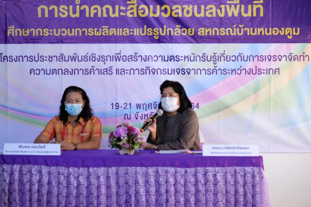 วันที่ 19 พฤศจิกายน 2564 นางอรมน ทรัพย์ทวีธรรม อธิบดีกรมเจรจาการค้าระหว่างประเทศ เปิดเผยระหว่างการลงพื้นที่ติดตามความสำเร็จโครงการ “ติดอาวุธเกษตรกรไทย บุกตลาดต่างประเทศด้วยความตกลงการค้าเสรี (FTA)” ที่จังหวัดสุโขทัย ว่า กรมได้หารือกับเกษตรกรและผู้ประกอบการบริษัท พิมพร บานาน่า อินเตอร์ฟู้ดส์ จำกัด สมาชิกสหกรณ์กล้วยแปรรูปตำบลหนองตูม จำกัด ที่ได้ให้คำแนะนำและพัฒนาสินค้าช่องทางการตลาดเพื่อทำตลาดจีน จนประสบผลสำเร็จเป็นอย่างดี และพร้อมที่จะขยายไปใน สปป.ลาว กัมพูชา อนาคตจะขยายไปในตลาดญี่ปุ่นด้วย