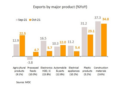 นอกจากนี้ สถานการณ์การระบาดในภูมิภาคอาเซียนบรรเทาลง หนุนให้ภาคการผลิตในหลายอุตสาหกรรมกลับมาส่งออกได้ดีขึ้น อาทิ รถจักรยานยนต์ (+35.6%) รถยนต์นั่งส่วนบุคคล (+18.2%) และอาหารแปรรูป (+4.7%) ส่วนตลาดส่งออกมีการเติบโตต่อเนื่องกระจายตัวในหลายตลาดส่งออกที่สำคัญ ยกเว้น ญี่ปุ่น ที่กลับมาหดตัวในรอบ 1 ปี