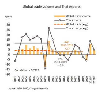 วิจัยกรุงศรี ประเมินภาคส่งออกจะยังคงเป็นแรงขับเคลื่อนเศรษฐกิจที่สำคัญของไทยในปี 2565 แม้จะขยายตัวในอัตราที่ชะลอลงจากปีนี้ แต่ยังคงสูงกว่าค่าเฉลี่ยในช่วง 10 ปีที่ผ่านมา ซึ่งล่าสุดได้ปรับเพิ่มคาดการณ์มูลค่าการส่งออกในปี 2564 (บนฐานข้อมูลกระทรวงพาณิชย์) คาดว่าจะขยายตัว 15% จากเดิมคาด 13.5% และมีแนวโน้มเติบโตได้ 4.5% ในปี 2565 เนื่องจาก (i) แรงส่งเชิงบวกจากการขยายตัวของการส่งออกสินค้าสำคัญหลายรายการและการนำเข้าวัตถุดิบและสินค้าขั้นกลาง (ii) ปัจจัยหนุนจากการฟื้นตัวของเศรษฐกิจประเทศคู่ค้า และ (iii) การพึ่งพากันภายในภูมิภาคมากขึ้น (Regionalization) จากความตกลงหุ้นส่วนทางเศรษฐกิจระดับภูมิภาค (RCEP) ซึ่งจะมีผลบังคับใช้ต้นปี 2565 จะเพิ่มโอกาสให้แก่ภาคการผลิตและการส่งออกของไทย ทั้งนี้ ยังต้องจับตาผลกระทบจากไวรัสสายพันธุ์ใหม่ที่อาจกระทบต่อกำลังซื้อของบางประเทศหากมีการล็อกดาวน์ หรืออาจส่งผลต่อต้นทุนการขนส่งหากมีมาตรการควบคุมที่เข้มงวดมากขึ้น