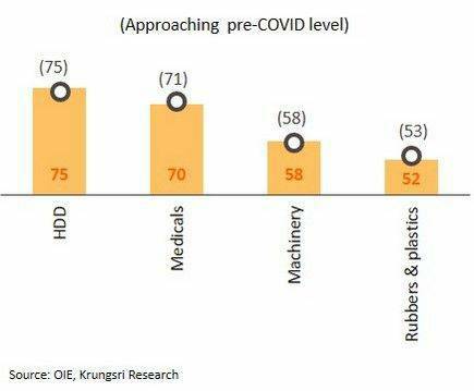 แต่เริ่มมีบางอุตสาหกรรมสำคัญที่มีอัตราการใช้กำลังการผลิตกลับไปสูงกว่าช่วงก่อนเกิดการระบาดแล้ว อาทิ อุตสาหกรรมรถยนต์ เวชภัณฑ์ยา แผงวงจรไฟฟ้าและเซมิคอนดักเตอร์ เครื่องใช้ไฟฟ้า และเฟอร์นิเจอร์