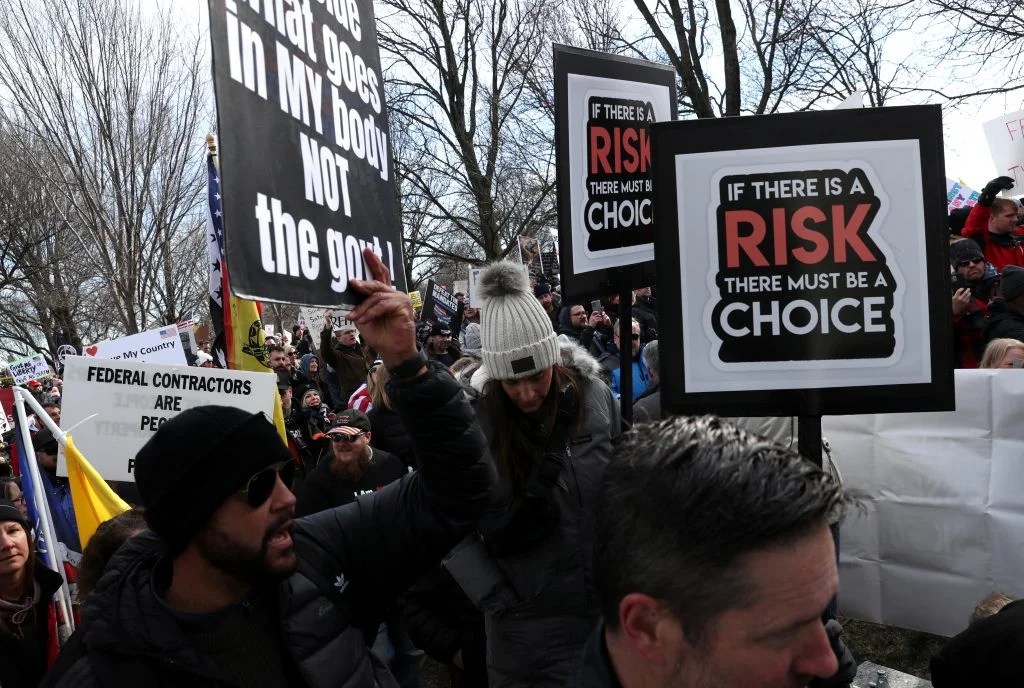 ชาวสหรัฐหลายพันคนได้ออกมาเดินขบวนประท้วง ณ กรุงวอชิงตัน ดีซี เมื่อวานนี้ (23 ม.ค.) เพื่อแสดงจุดยืนต่อต้านข้อบังคับด้านวัคซีนและมาตรการสกัดโควิด-19 อื่น ๆ ของภาครัฐ ท่ามกลางความผิดหวังและท้อแท้ของประชาชนจากยอดผู้ติดเชื้อรายใหม่ที่ยังคงทะยานสูงขึ้นต่อเนื่อง