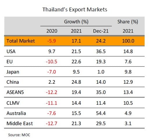 นอกจากนี้ เงินบาทที่อ่อนค่าอาจช่วยหนุนด้านรายรับของผู้ส่งออก อย่างไรก็ตาม ในช่วงต้นปีการระบาดของโอมิครอนที่แพร่ระบาดอย่างรวดเร็วในหลายประเทศ อาจกระทบต่อกำลังซื้อของบางประเทศ หรืออาจส่งผลต่อต้นทุนการขนส่งเนื่องจากมาตรการควบคุมที่เข้มงวดมากขึ้น