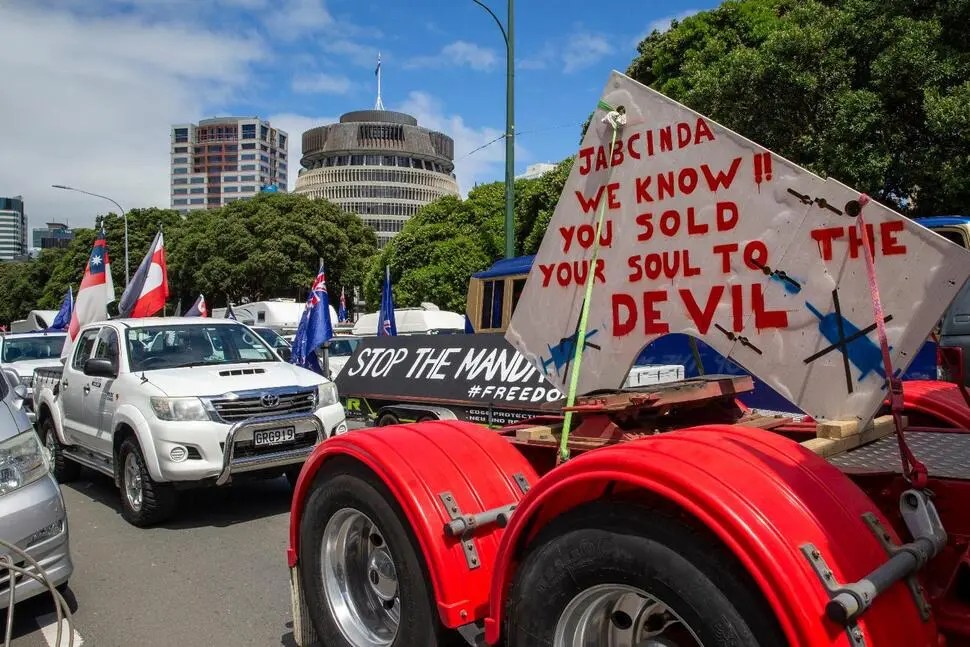 ผู้นำนิวซีแลนด์แถลงในขณะที่ด้านนอกรัฐสภามีผู้ชุมนุมเรียกร้องให้ทางการยกเลิกมาตรการจำกัดการระบาดทั้งหมดและคำสั่งบังคับฉีดวัคซีน มาตรการจำกัดเข้มงวดที่นิวซีแลนด์ใช้มาตลอด 2 ปีช่วยให้ยอดติดเชื้อและเสียชีวิตอยู่ในระดับต่ำ โดยมีผู้ติดเชื้อ 18,000 คน และเสียชีวิต 53 คน จากประชากรทั้งหมด 5 ล้านคน แต่สร้างความไม่พอใจให้แก่ผู้ที่ต้องกักโรคในประเทศและผู้ที่ไม่สามารถเดินทางกลับมาพบหน้าครอบครัวเพราะการปิดพรมแดน อีกทั้งยังกระทบต่อธุรกิจที่พึ่งพารายได้จากนักท่องเที่ยวต่างชาติ อาร์เดิร์นวัย 41 ปี มีคะแนนนิยมลดลงในผลการสำรวจวันนิวส์ (1 News) ของสำนักสำรวจแคนทาร์พับลิกที่เผยแพร่เมื่อเดือนก่อน เพราะคนไม่พอใจที่เธอล่าช้าเรื่องฉีดวัคซีนและยกเลิกมาตรการข้อจำกัดต่าง ๆ.