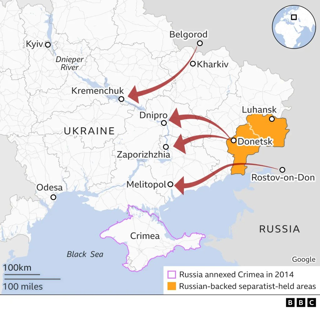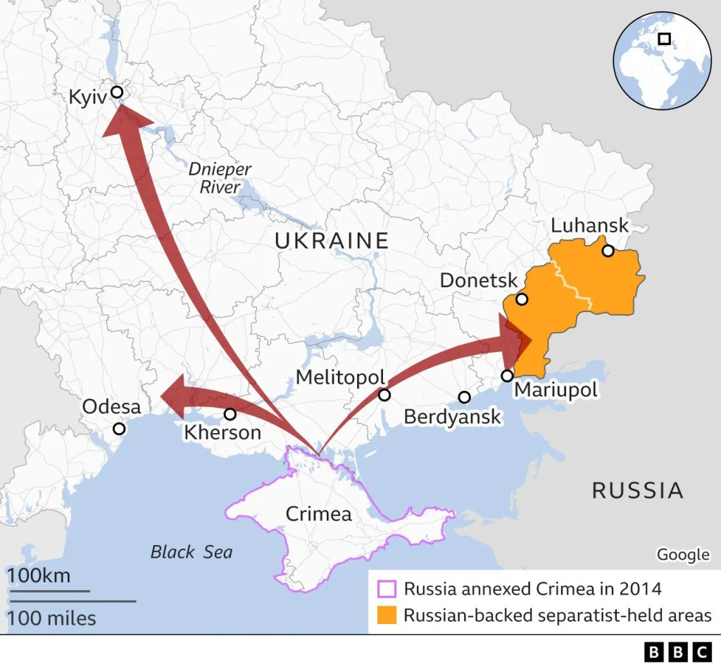 ลอนดอน 24 ก.พ.- เว็บไซต์บรรษัทกระจายเสียงและแพร่ภาพอังกฤษหรือบีบีซี (BBC) สำรวจเส้นทางที่รัสเซียอาจใช้บุกยูเครน หลังจากรัสเซียสั่งทหารเข้าไปประจำการทางตะวันออกของยูเครน แต่ชาติตะวันตกเชื่อว่า รัสเซียอาจกำลังวางแผนยึดยูเครนทั้งประเทศ