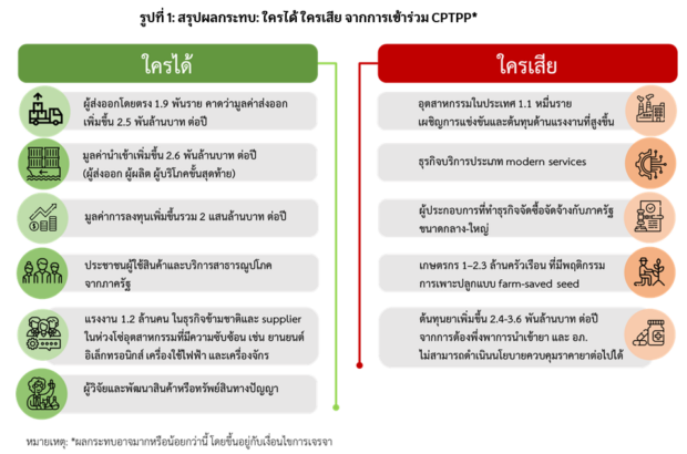 ทั้งนี้ ท่านสามารถอ่านรายละเอียดเพิ่มเติม จากบทความฉบับเต็มเรื่อง “CPTPP: ใครได้ ใครเสีย และทางออกของประเทศ” ได้ที่ website ของสถาบันวิจัยเศรษฐกิจป๋วย อึ๊งภากรณ์