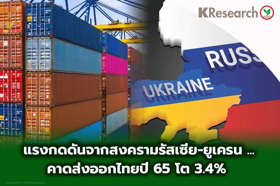 ศูนย์วิจัยกสิกรไทย ปรับลดประมาณการส่งออกไทยปี 2565 ลงมาอยู่ที่ 3.4% จากเดิม 4.3% เนื่องจากความท้าทายของสถานการณ์ความขัดแย้งระหว่างรัสเซีย-ยูเครน ที่ทำให้บรรยากาศเศรษฐกิจทั่วโลกชะลอตัวลงกว่าในกรณีที่ไม่มีวิกฤตดังกล่าว โดยคาดว่าแรงขับเคลื่อนการส่งออกล้วนเป็นแรงหนุนของราคาสินค้าในกลุ่มปัจจัยการผลิตที่เกี่ยวเนื่องกับน้ำมัน สินค้าเกษตร และกำลังซื้อในกลุ่มสินค้าจำเป็นที่ยังเป็นที่ต้องการในตลาดโลก อาทิ เม็ดพลาสติก เคมีภัณฑ์ ยางพาราและผลิตภัณฑ์ ผลไม้ และอาหารทะเล โดยการส่งออกไปยังสหภาพยุโรป (ไม่รวมอังกฤษ) เป็นตลาดที่มีอัตราการเติบโตต่ำที่สุดในบรรดาตลาดส่งออกหลักของไทย