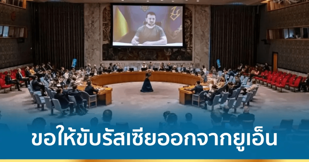 ประธานาธิบดีเซเลนสกี กล่าวสุนทรพจน์ทางออนไลน์ต่อที่ประชุมคณะมนตรีความมั่นคงยูเอ็นหรือยูเอ็นเอสซี (UNSC) เมื่อวันอังคารตามเวลาสหรัฐ เรียกร้องให้ขับรัสเซียออกจากยูเอ็นและกล่าวหารัสเซียว่าเป็นรัฐก่อการร้าย โดยระบุว่า ทั้งที่รัสเซียละเมิดหลักการพื้นฐานของยูเอ็นและระเบียบกฎหมายสากล แต่ก็ยังไม่ถูกลงโทษในระดับโลก เขาขอให้ยูเอ็นส่งคณะผู้แทนไปยังห้างสรรพสินค้าในเมืองเครเมนชุก ทางตอนกลางของยูเครนที่ถูกรัสเซียยิงขีปนาวุธโจมตีเมื่อวันจันทร์ และขอให้ตั้งอนุญาโตตุลาการสากลพิเศษขึ้นสอบสวนการกระทำของทหารรัสเซียในยูเครน ผู้นำยูเครนจบสุนทรพจน์ด้วยการขอให้ที่ประชุมยูเอ็นเอสซีสงบนิ่ง เพื่อรำลึกถึงชาวยูเครนทุกคนที่ถูกสังหารในสงครามนี้
