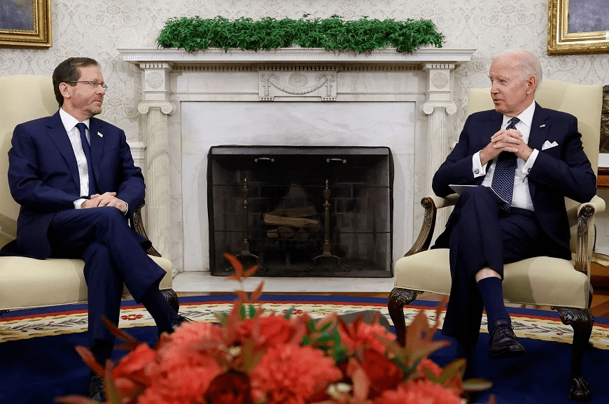 ระหว่างนั่งอยู่ข้างๆ เฮอร์ซอก ในห้องทำงานรูปไข่ของทำเนียบขาว ทาง ไบเดน ได้กล่าวยกย่องอิสราเอลที่กำลังบรรลุข้อตกลงที่ล่าช้ามานานกับเลบานอน เกี่ยวกับเขตแดนทางทะเลของทั้งสองประเทศ ข้อตกลงที่มีสหรัฐฯ เป็นคนกลาง