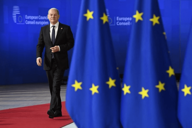 นายกรัฐมนตรี โอลาฟ ชอลซ์ ของเยอรมนี ขณะเดินทางมาถึงเพื่อเข้าร่วมการประชุมซัมมิต ของคณะมนตรียุโรป ณ กรุงบรัสเซลส์ วันพฤหัสบดี (15 ธ.ค.)