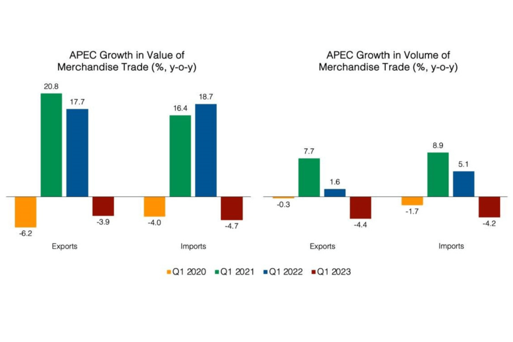 ความไม่แน่นอนของอัตราเงินเฟ้อและการฟื้นตัวของเศรษฐกิจโลกควบคู่ไปกับปัจจัยทางภูมิรัฐศาสตร์มีอิทธิพลต่อประสิทธิภาพการค้า นโยบายและความสัมพันธ์ บริษัทบางแห่งได้เปลี่ยนแปลงกลยุทธ์ด้านห่วงโซ่อุปทาน ในขณะที่ความต้องการสินค้าทั่วโลกลดลง มาตรการจำกัดการค้าและการเพิ่มขึ้นของมาตรการอย่างต่อเนื่องที่อาจเกิดขึ้นในบริบทนี้ อาจจะส่งผลเสียต่อการเติบโตของการค้า การรวมตัวกันของปัจจัยเหล่านี้ส่งผลให้ปริมาณการค้าสินค้าเอเปคเพื่อการส่งออกหดตัวร้อยละ 4.4 และนำเข้าร้อยละ 4.2 การเติบโตของมูลค่าการค้าสินค้ายังได้เข้าสู่แดนลบที่ร้อยละ -3.9 สำหรับการส่งออกและร้อยละ -4.7 สำหรับการนำเข้า