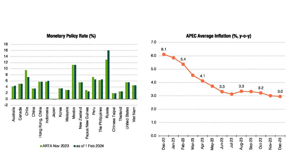 อัตราเงินเฟ้อของสมาชิกเอเปคเฉลี่ยลดลงในปี 2023 อยู่ที่ร้อยละ 3.8 จากระดับร้อยละ 5.9 ในปีที่แล้ว เพราะ การปรับขึ้นอัตราดอกเบี้ยนโยบายการเงินที่สอดคล้องกันและต่อเนื่องกันในหลายเขตเศรษฐกิจ อัตราเงินเฟ้อในภูมิภาคได้รับการคาดว่าจะยังคงอยู่ในเส้นทางขาลงในระยะสั้นที่ร้อยละ 3.0 ในปี 2024 และร้อยละ 2.6 ในปี 2025 ควบคู่ไปกับการชะลอตัวของอัตราเงินเฟ้อทั่วโลก อย่างไรก็ตามยังจำเป็นต้องจับตาดูความผันผวนของอัตราแลกเปลี่ยน โดยเฉพาะอย่างยิ่งเมื่อค่าเงินที่อ่อนค่าลงทำให้การจัดการเงินเฟ้อยุ่งยากและอาจนำไปสู่ค่าเงินที่ไม่สมดุลกัน ซึ่งส่งผลต่อภาระผูกพันในการชำระเงินระหว่างเดือนกุมภาพันธ์ 2023 ถึงกุมภาพันธ์ 2024 สกุลเงินของสมาชิกเอเปค 17 เขตเศรษฐกิจอ่อนค่าลงเมื่อเทียบกับดอลลาร์สหรัฐอยู่ระหว่างร้อยละ -1.3 ถึง -22.6