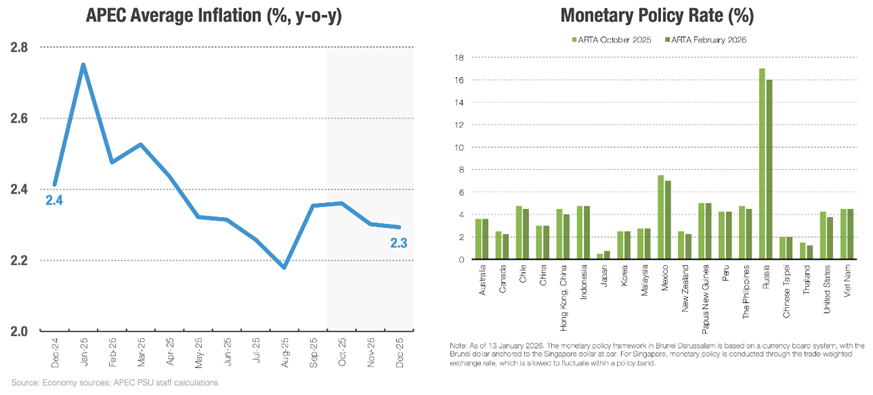 อัตราเงินเฟ้อลดลงอย่างต่อเนื่องในประเทศสมาชิกเอเปคส่วนใหญ่ คาดการณ์อัตราเงินเฟ้อเฉลี่ยในปี 2025 อยู่ที่ประมาณ 2.4 เปอร์เซ็นต์ ซึ่งต่ำกว่า 2.6 เปอร์เซ็นต์ในปี 2024 สะท้อนให้เห็นถึงราคาพลังงานและอาหารที่ลดลง ราคาน้ำมันลดลงเนื่องจากอุปทานมีเพียงพอและมีการฟื้นตัวของสินค้าคงคลัง ขณะที่ราคาอาหารปรับตัวลดลงเนื่องจากผลผลิตทางการเกษตรดีขึ้น