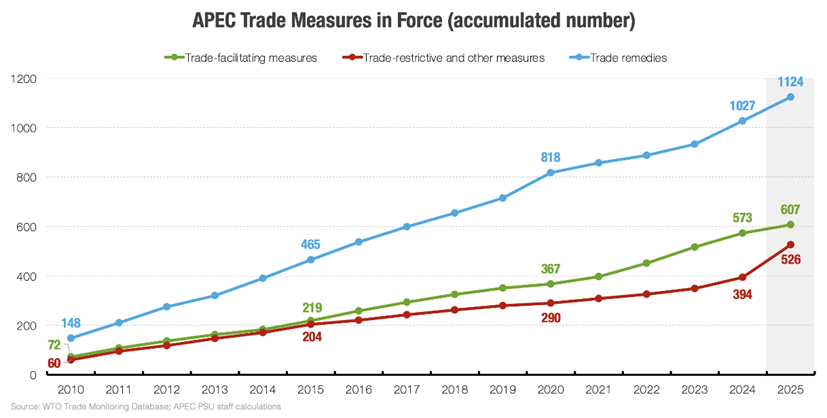 อย่างไรก็ตาม พลวัตทางการค้าเชิงบวกเหล่านี้เกิดขึ้นควบคู่ไปกับสภาพแวดล้อมทางนโยบายที่ไม่เอื้ออำนวย มาตรการจำกัดทางการค้าเพิ่มขึ้นอย่างรวดเร็วในปี 2025 โดยมีสาเหตุมาจากมาตรการภาษีและมาตรการที่ไม่ใช่ภาษีใหม่ๆ แม้ว่าประเทศต่างๆ จะยังคงดำเนินมาตรการอำนวยความสะดวกทางการค้าต่อไป แต่มาตรการเหล่านั้นก็ถูกบดบังด้วยข้อจำกัดใหม่ๆ ซึ่งยิ่งเพิ่มความท้าทายในระยะกลาง ความไม่แน่นอนของนโยบายการค้ายังคงอยู่ในระดับสูง ส่งผลกระทบต่อความเชื่อมั่นทางธุรกิจและการวางแผนการลงทุน