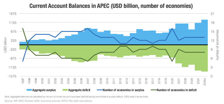 ดุลบัญชีเดินสะพัดเกินดุลและขาดดุลยังคงมีอยู่ต่อเนื่องในกลุ่มประเทศเอเปค และมีแนวโน้มกว้างขึ้นตั้งแต่ต้นทศวรรษ 2020 แนวโน้มเหล่านี้สะท้อนถึงความไม่สมดุลทางการค้าเชิงโครงสร้างที่เกิดจากความแตกต่างในด้านการออม การลงทุน ความสามารถในการแข่งขัน และอุปสงค์ภายในประเทศ แม้ว่าความไม่สมดุลดังกล่าวอาจเกิดขึ้นพร้อมกับการเติบโตได้ แต่การเกินดุลหรือขาดดุลเป็นเวลานานจะเพิ่มความเสี่ยงต่อภาวะช็อกภายนอกและความผันผวนทางการเงิน การเสริมสร้างอุปสงค์ภายในประเทศและการลงทุนที่มีประสิทธิภาพในประเทศที่มีดุลบัญชีเกินดุล ในขณะเดียวกันก็ปรับปรุงความสามารถในการแข่งขัน การกระจายการส่งออก และอัตราการออมในประเทศที่มีดุลบัญชีขาดดุล จะช่วยรักษาระดับการเติบโตและลดความเสี่ยงที่เกี่ยวข้องกับความไม่สมดุลได้