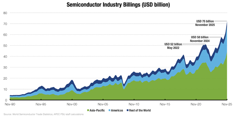 ลักษณะเด่นประการหนึ่งของวัฏจักรปัจจุบันคือขนาดของการลงทุนในปัญญาประดิษฐ์ (AI) และเทคโนโลยีดิจิทัล รายได้จากการผลิตเซมิคอนดักเตอร์ทั่วโลกแตะระดับสูงสุดเป็นประวัติการณ์ในปี 2025 โดยส่วนใหญ่มาจากความต้องการที่เกี่ยวข้องกับ AI การลงทุนเหล่านี้สามารถเพิ่มผลผลิตและสนับสนุนการเติบโตในระยะยาวทั่วทั้งภูมิภาคได้