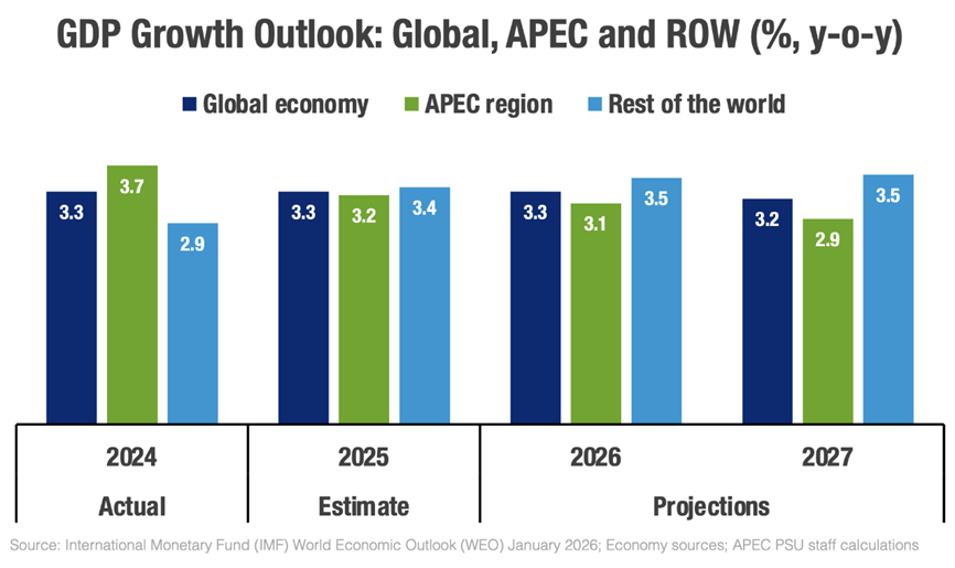 คาดการณ์ว่าเศรษฐกิจของกลุ่มประเทศเอเปคจะเติบโตประมาณ 3.1 เปอร์เซ็นต์ในปี 2026 ซึ่งทรงตัวและปรับเพิ่มขึ้นเล็กน้อยเมื่อเทียบกับการคาดการณ์ก่อนหน้านี้ที่ 2.9 เปอร์เซ็นต์ ความแข็งแกร่งนี้โดดเด่นท่ามกลางความไม่แน่นอนทั่วโลกที่ยังคงมีอยู่ แสดงให้เห็นถึงศักยภาพของภูมิภาคในการปรับตัวผ่านห่วงโซ่อุปทานที่ยืดหยุ่น ตลาดที่หลากหลาย และนวัตกรรมอย่างต่อเนื่อง